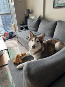 My husband and I live with our dog Ava! We adopted her last year in May. She is super calm and loves cuddles, food and to play with other dogs.