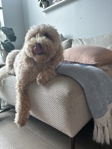 Two stories condo, living room downstairs and bedroom and washroom upstairs. Small balcony with high guard. Lots of plants but very little that can be reached by dogs.